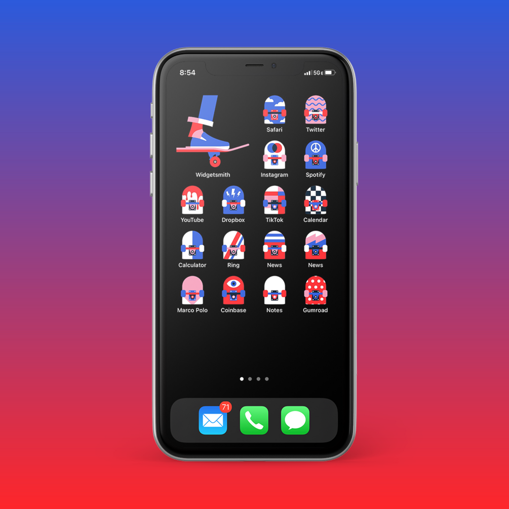 Skate or die! This vibrant collection of skateboards is for iOS 14. Includes 24 skateboard icons, 2 widgets, and a black wallpaper.